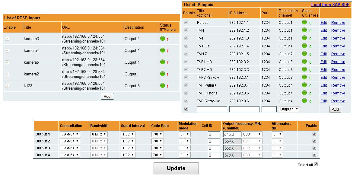 - reception of IP stream with a bitrate of up to 200 Mbps and conversion of this stream into freely configured four neighboring DVB-T multiplexes (MUXes)